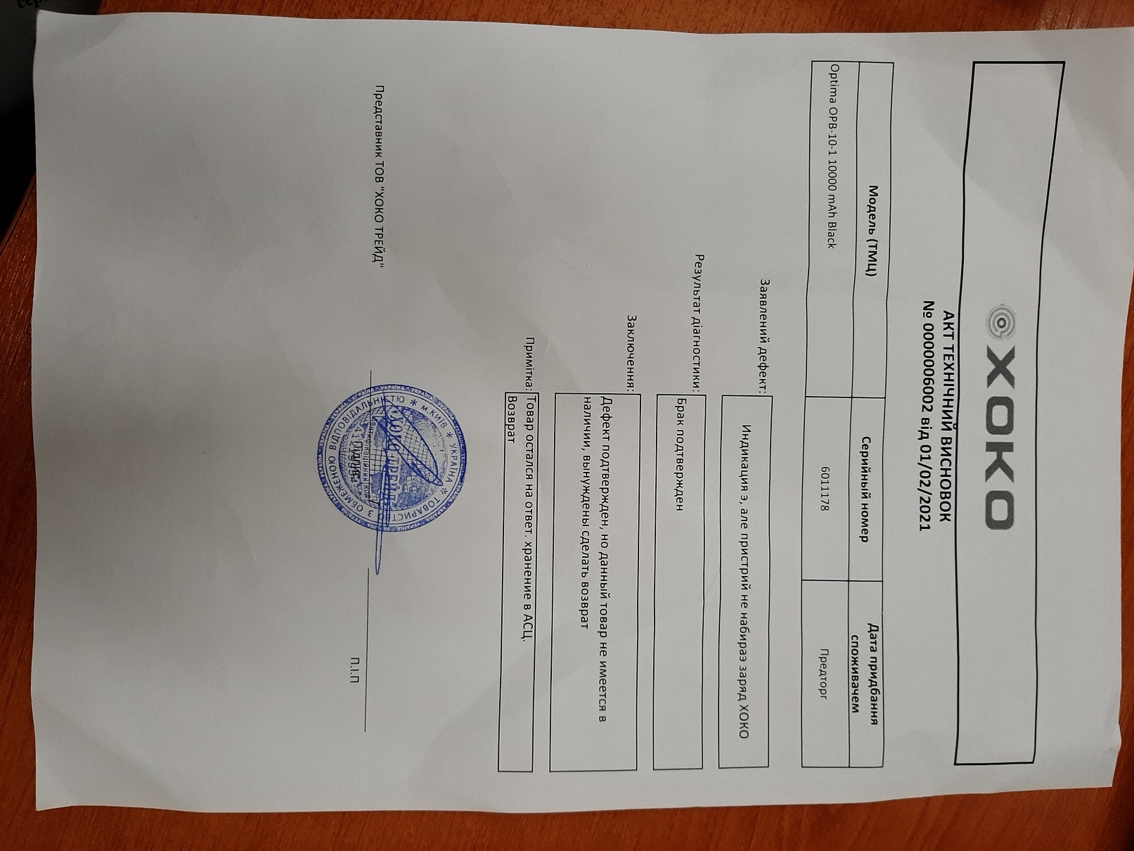 Для клиентского возврата товар должен пройти сервисное обслуживание в СЦ Хоко Трейд ремонт/диагностика через ГВР.