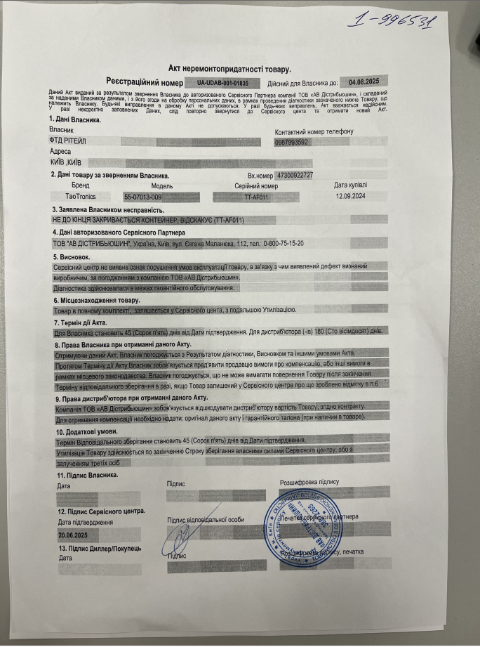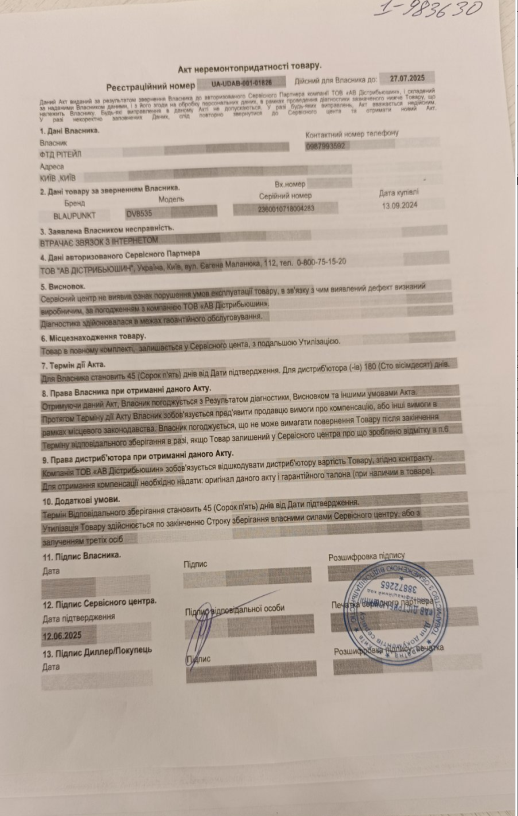 5. Обезательно заполняем низ в акте(дата, подпись клиєнта/дата, подпись, печать магазина)